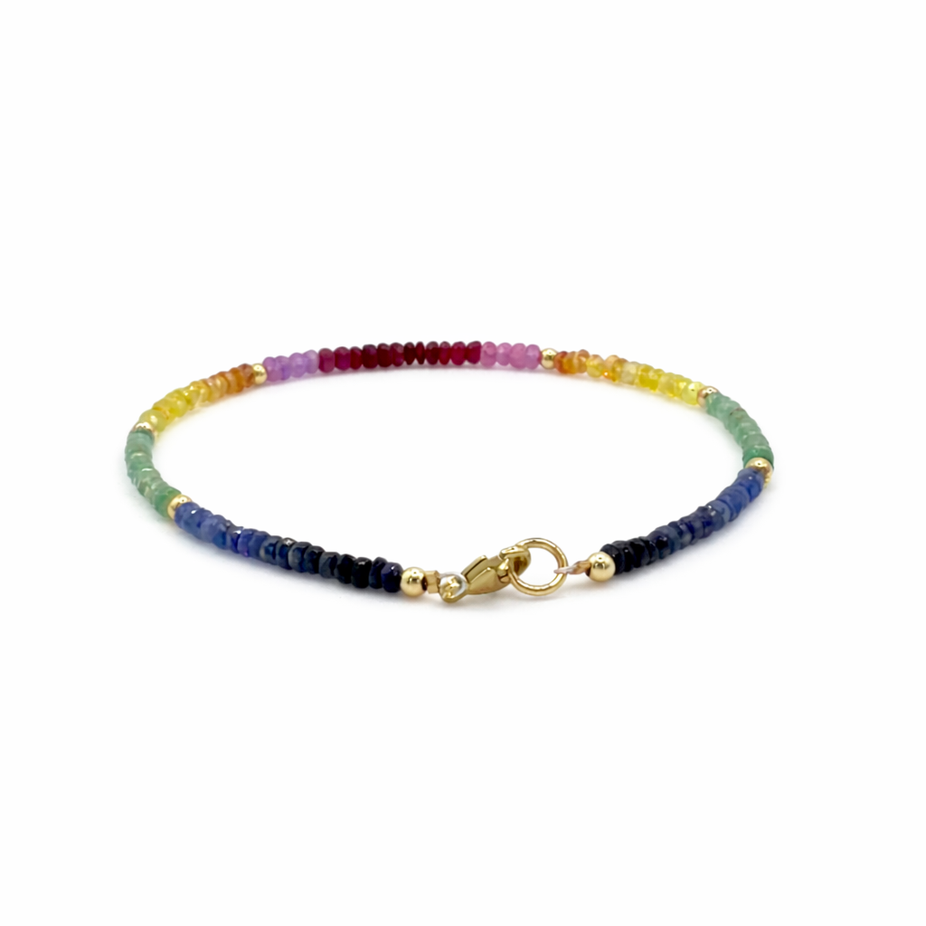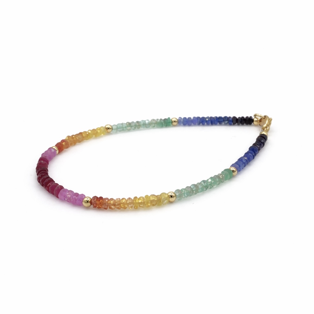 Offering a captivating display of the most precious gemstones, this 9 Carat Gold Sapphire, Ruby, and Emerald Bracelet is a true masterpiece of colour and craftsmanship. Expertly designed, the piece features a hand-picked arrangement of vibrant 2.5mm faceted beads. The mesmerising deep blues of the sapphires, the rich reds of the rubies, and the lush, vivid greens of the emeralds are perfectly offset by the warm glow of solid 9 carat gold beads scattered gracefully along the design.