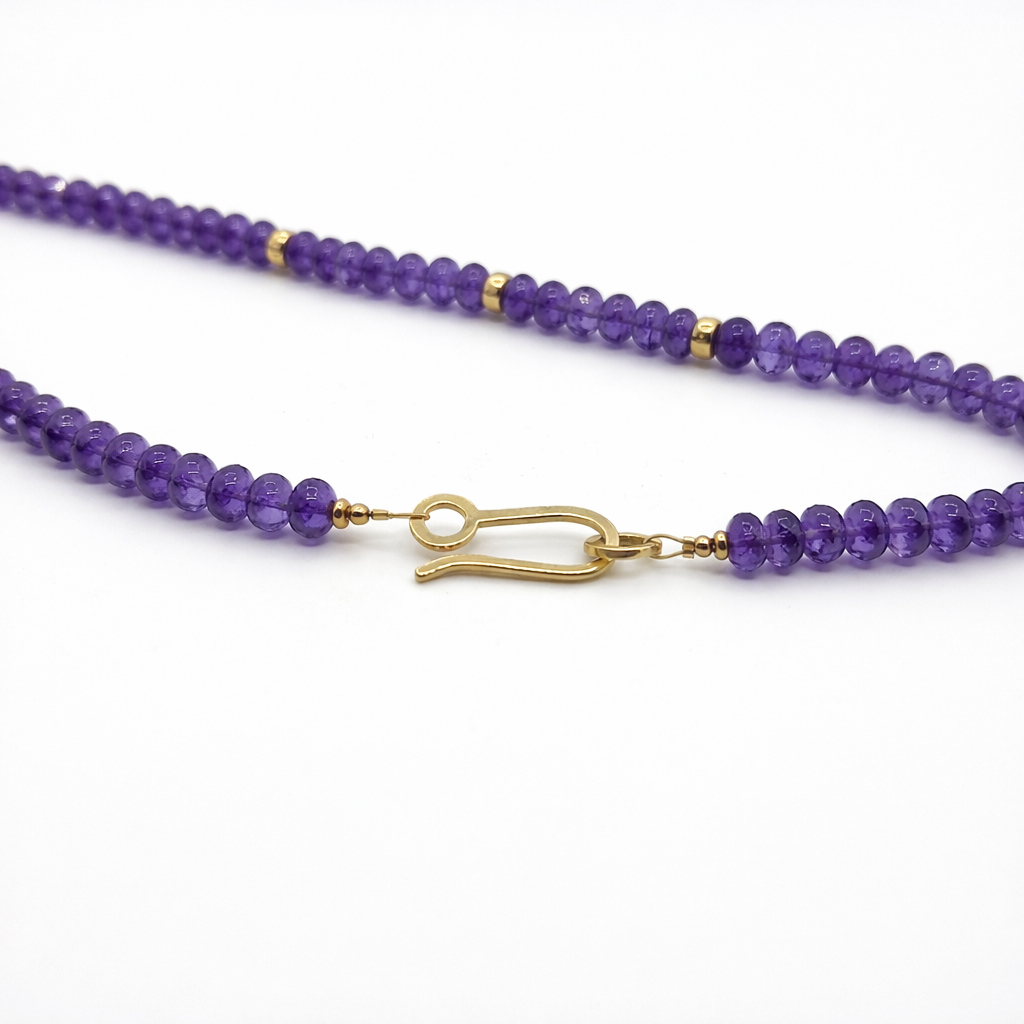 What sets this piece apart is the handmade 9 carat gold hook clasp. Unlike standard factory findings, this clasp is a design element in its own right, adding a modern twist and a touch of artisanal luxury to the back of the neck. With a length of 17 inches, it sits elegantly at the collarbone, making it perfect for wearing with open necklines. As the birthstone for February, Amethyst represents peace and clarity, making this necklace a meaningful gift or a personal treasure.