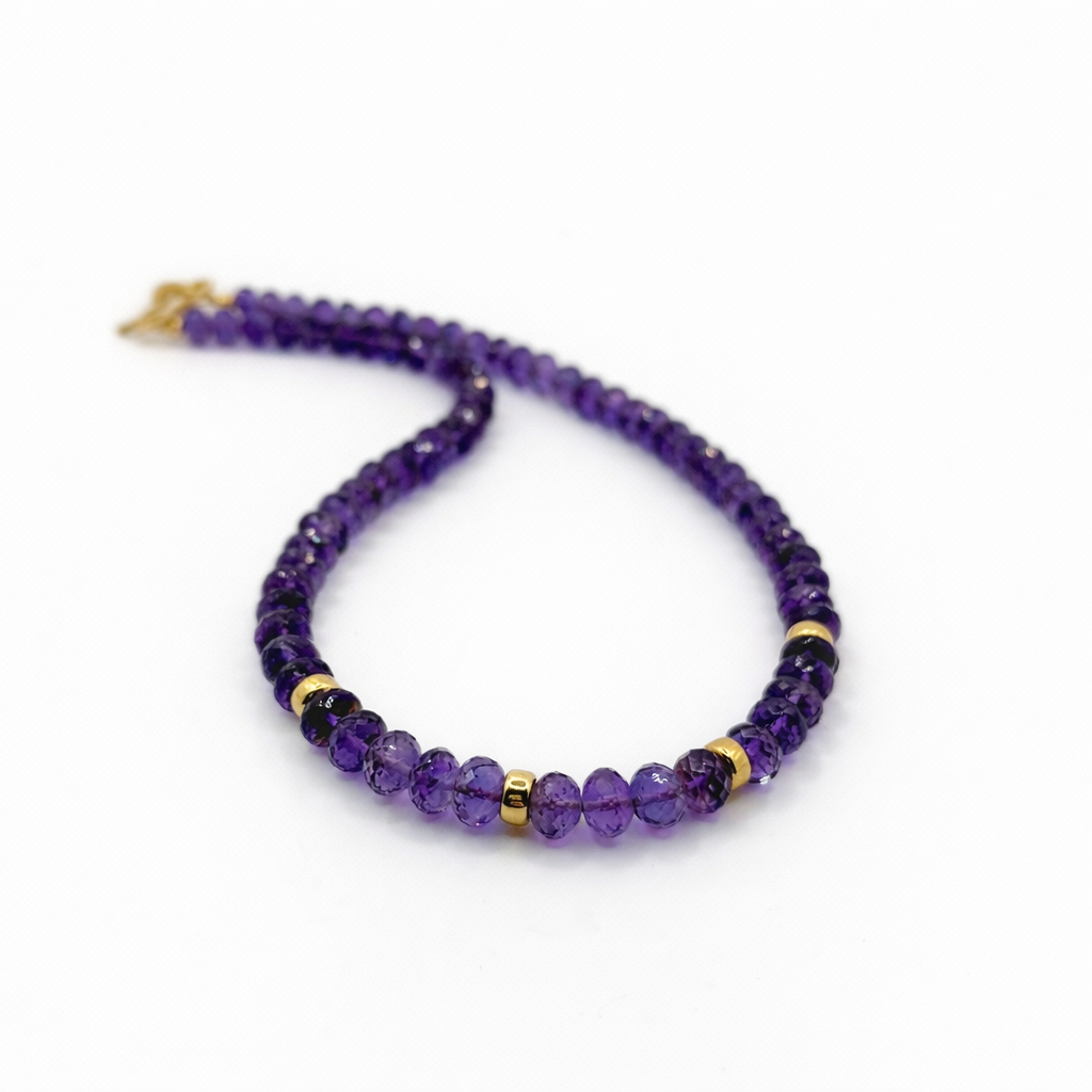 - Strung with bright 7mm faceted Amethyst beads.