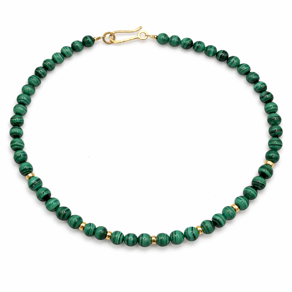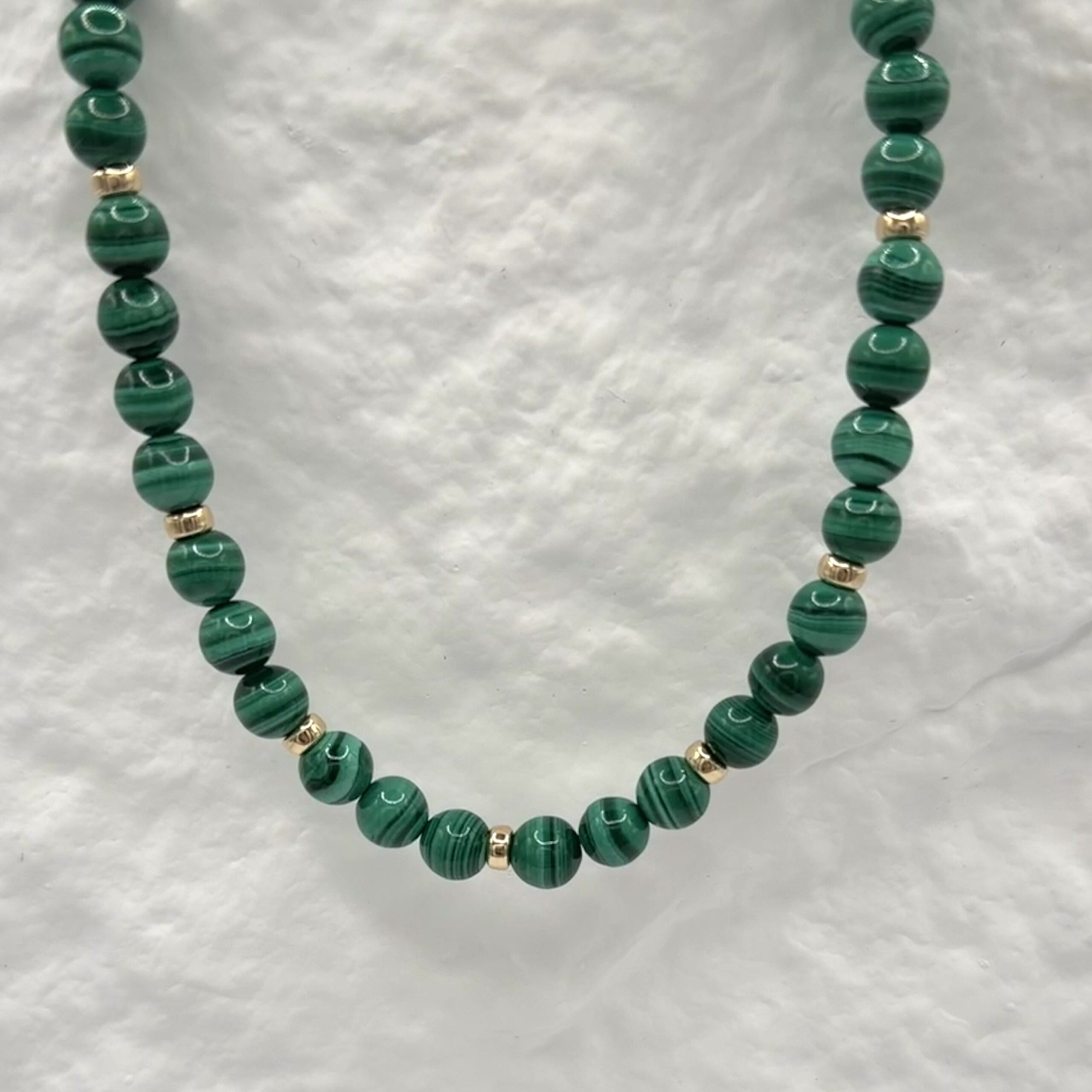 Showcasing the deep, verdant beauty of nature, this 9 Carat Gold Malachite Necklace is a statement piece with organic charm. Hand-strung in our Devon studio, the necklace features smooth 8mm Malachite beads. Each bead displays the gemstone’s characteristic light and dark green banding, ensuring that every necklace is truly one-of-a-kind.