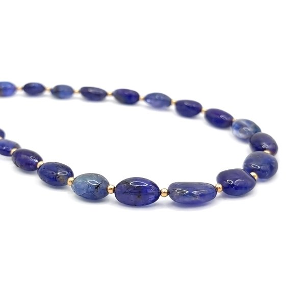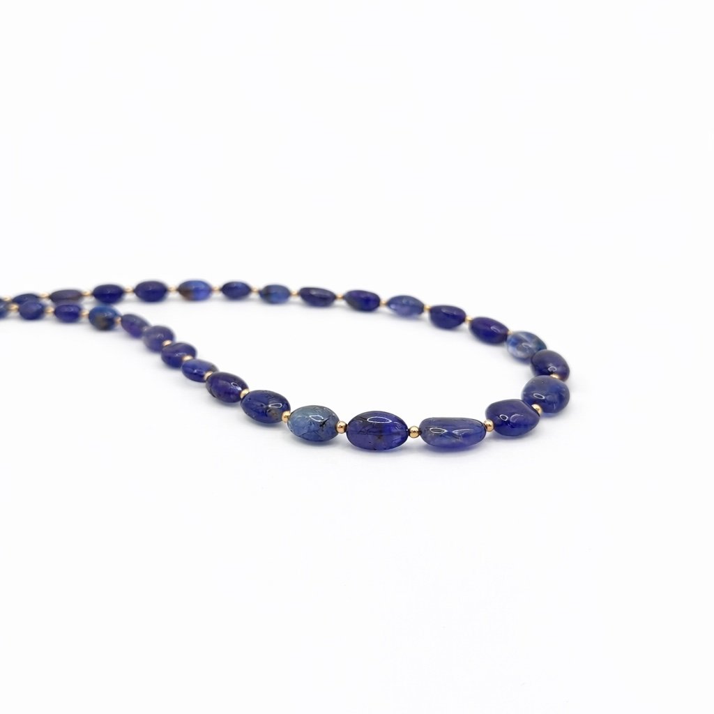 Showcasing the mesmerising violet-blue hues of this rare gemstone, this 9 Carat Gold Tanzanite Necklace is a truly unique and captivating piece. The design features a stunning arrangement of gorgeous, hand-picked Tanzanite beads, each beautifully tumbled into an organic, free-form pebble style. This distinctive shape highlights the natural beauty and striking colour of the stones, perfectly complemented by delicate 9 carat gold details interspersed throughout the necklace.