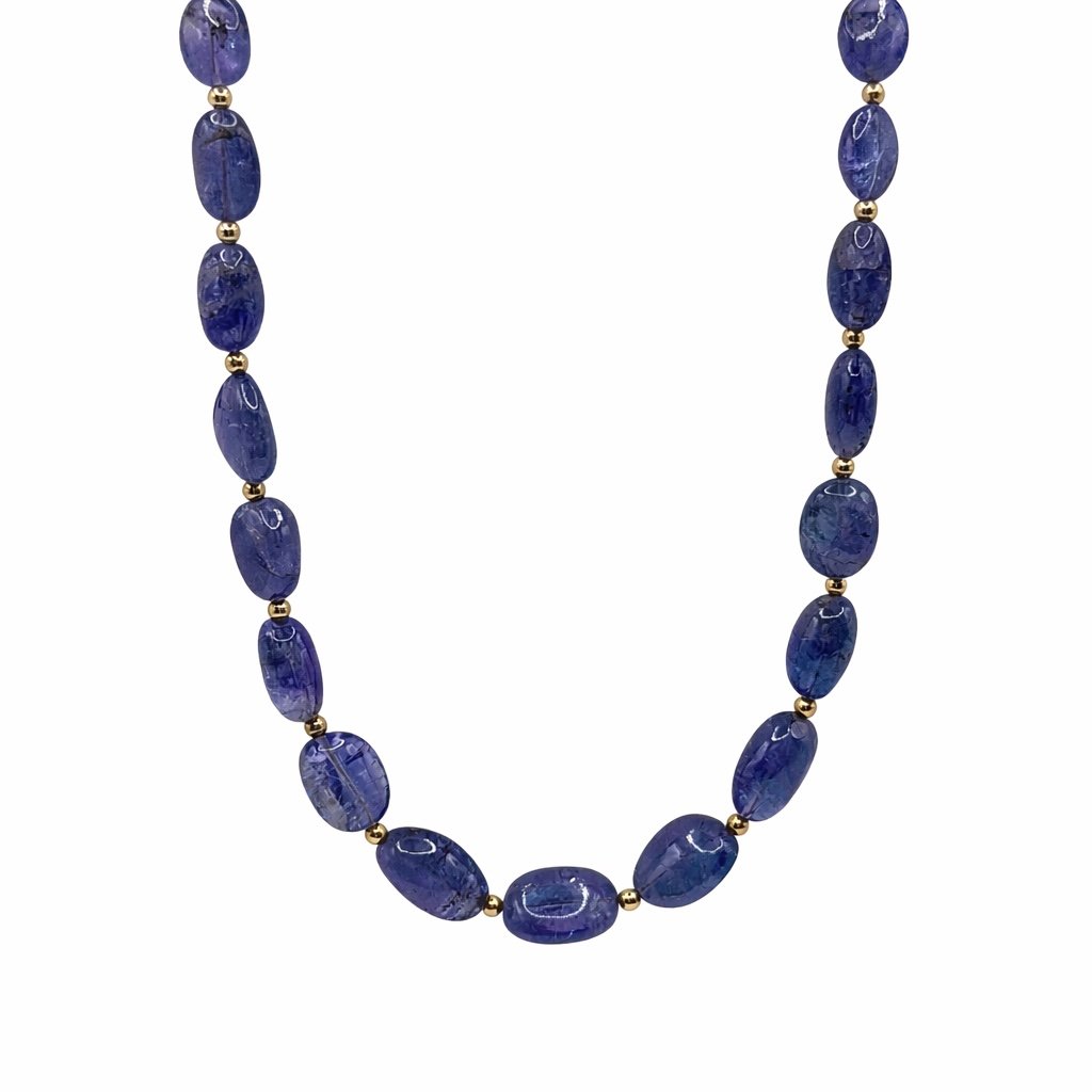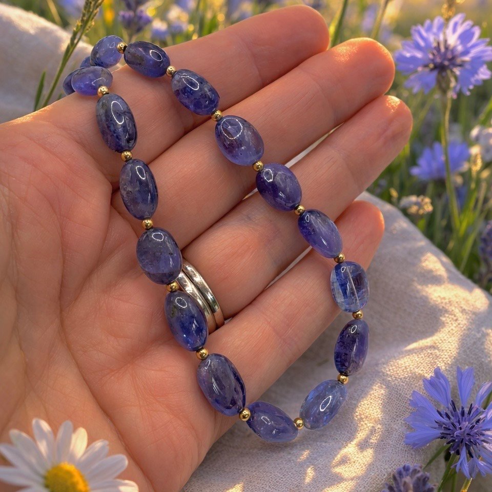 - Features gorgeous hand-picked, free-form pebble Tanzanite beads.
