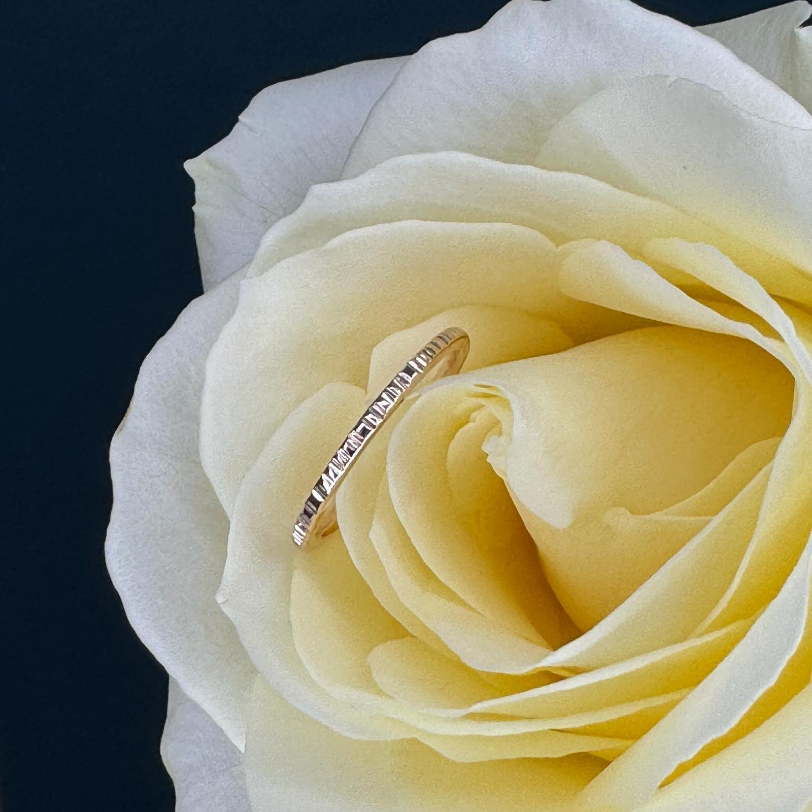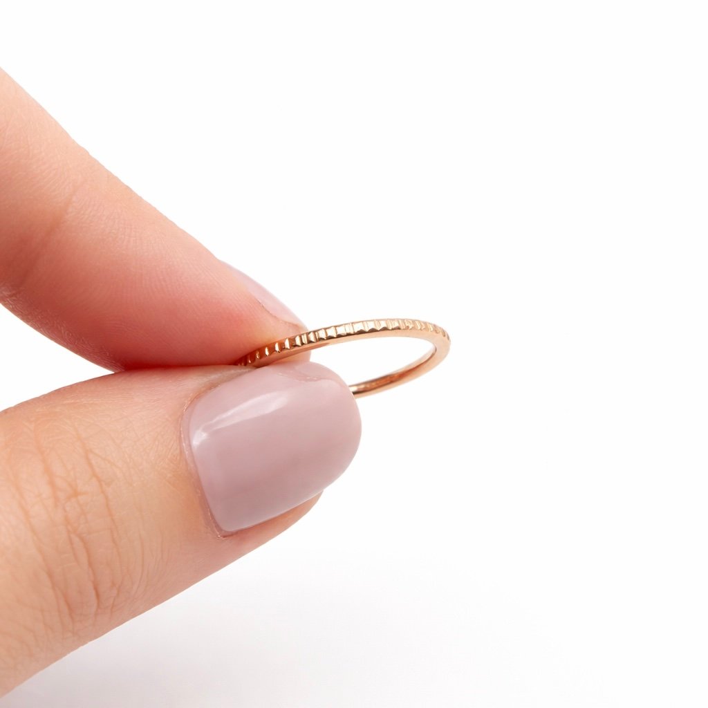 Measuring 1.6mm in width and 1.75mm in thickness, the ring offers a dainty but durable profile with a solid weight of 1.69g. Its slender design makes it fantastic as a standalone piece for a minimalist everyday look, or it can be effortlessly mixed and matched with other bands in our collection to build your own bespoke, textured stack.