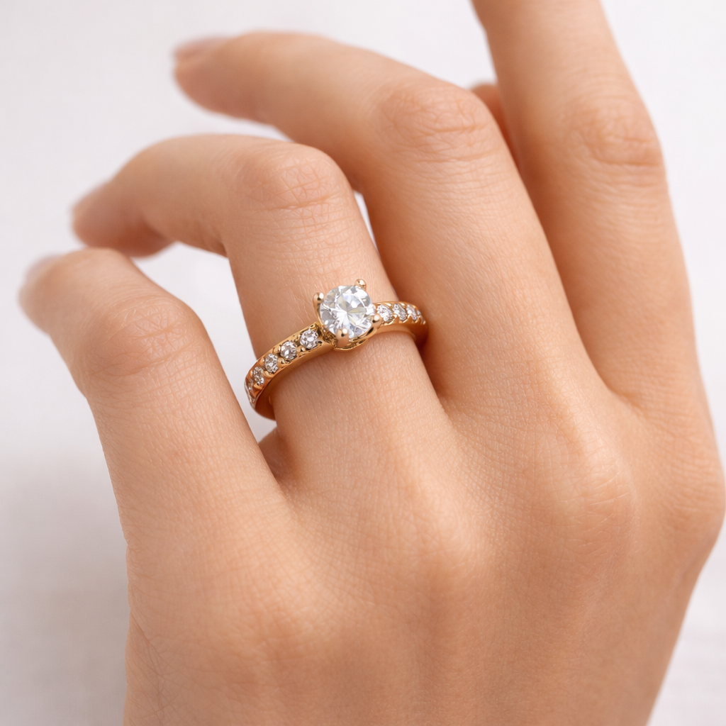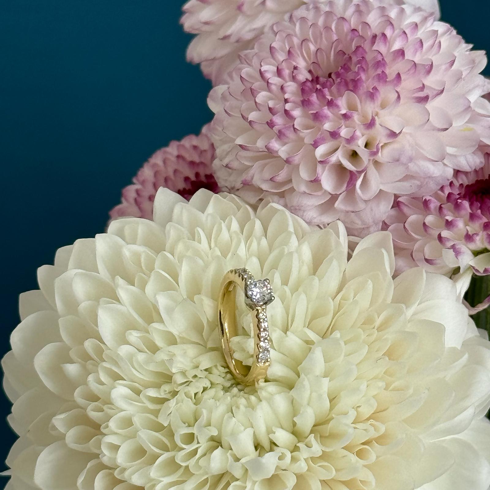 - Central 0.3ct Round Brilliant Cut Diamond (GIA Certified E SI1).