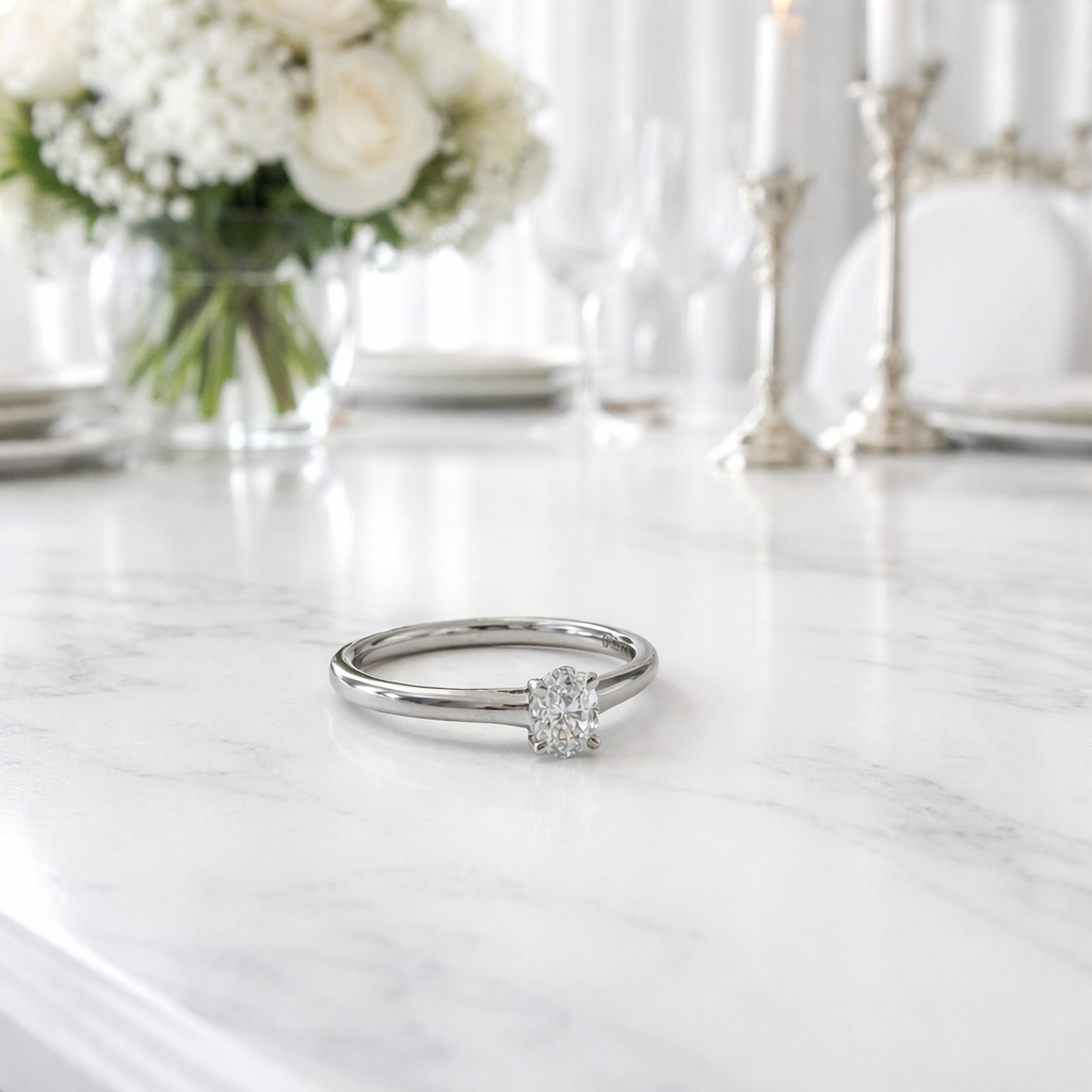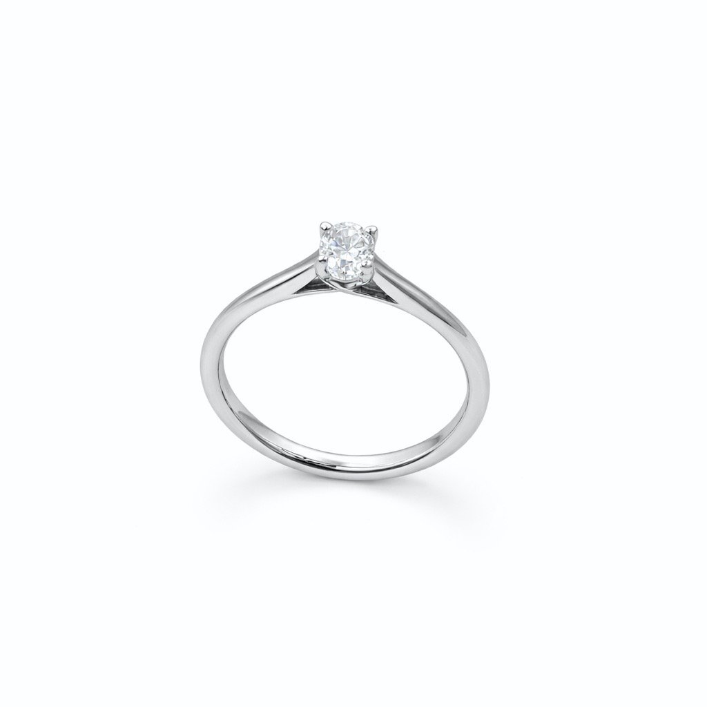 Epitomising pure luxury and modern sophistication, this Platinum Diamond Solitaire Ring is an exceptional choice for a momentous occasion. The design showcases a beautiful 0.4ct oval-cut diamond, celebrated for its elegant elongated shape and remarkable brilliance. This magnificent FSI quality diamond is securely held within a classic four-claw setting, allowing maximum light to interact with the stone to create a truly breathtaking sparkle.