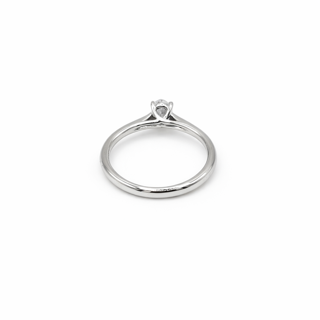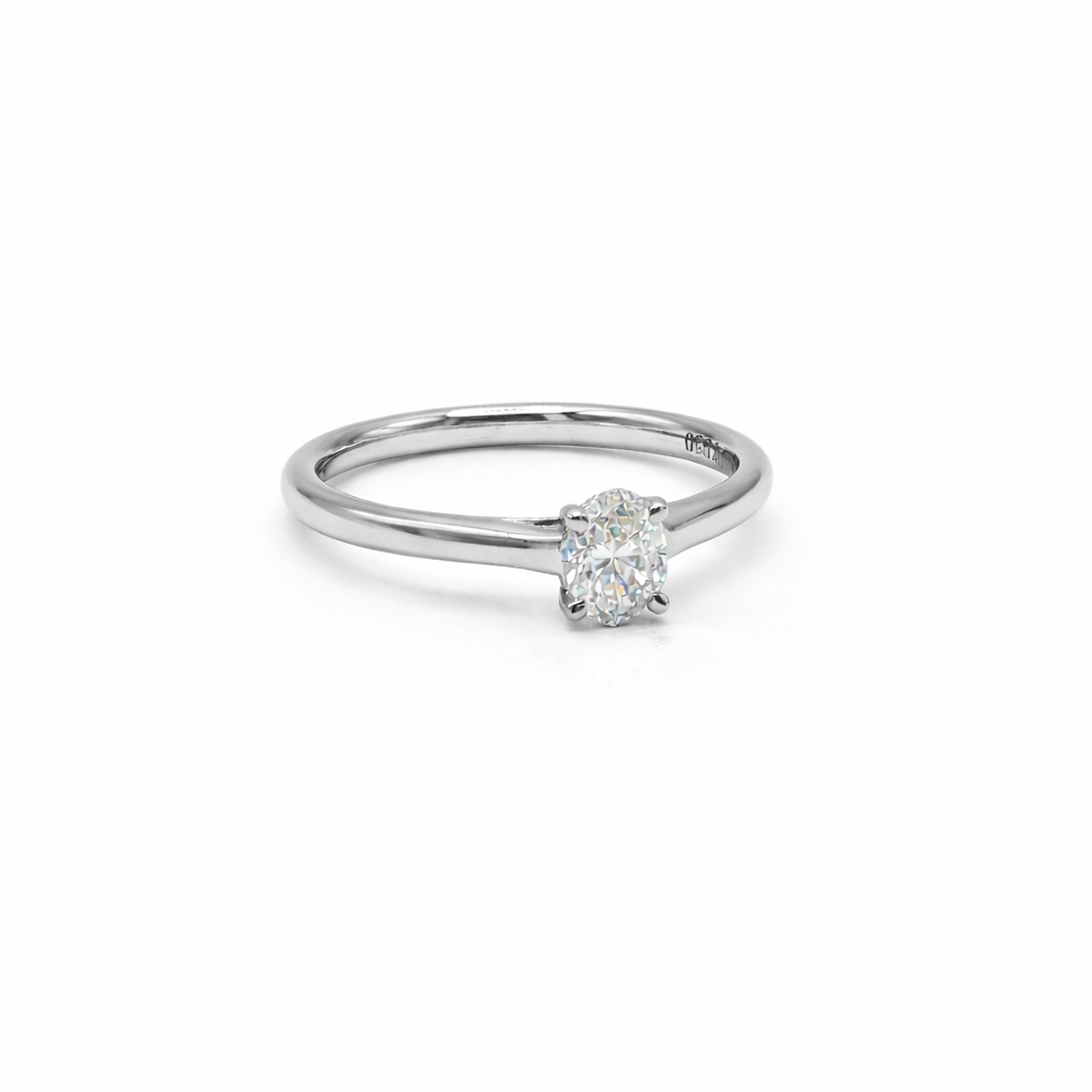 This breathtaking platinum solitaire ring features a beautiful 0.4ct oval-cut diamond held securely in a classic four-claw setting upon a refined slender band.
