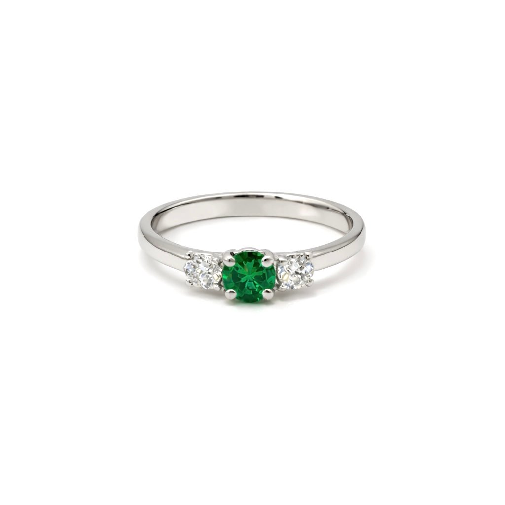 • Features a striking 0.30ct round-cut emerald with a vibrant green hue.