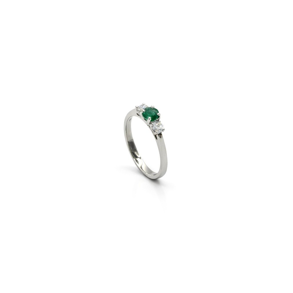 This breathtaking handmade platinum ring features a vibrant 0.30ct round-cut emerald as its centrepiece, elegantly framed by two sparkling brilliant-cut diamonds upon a polished platinum band.