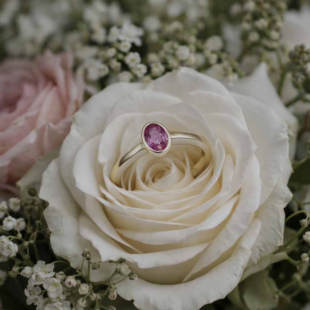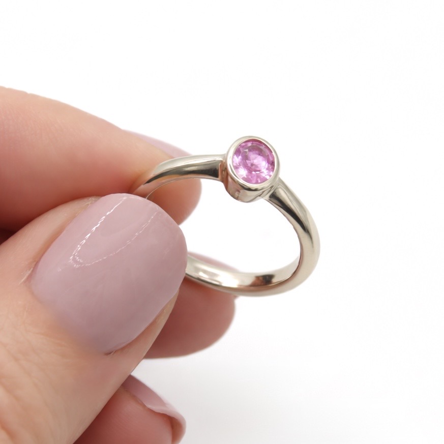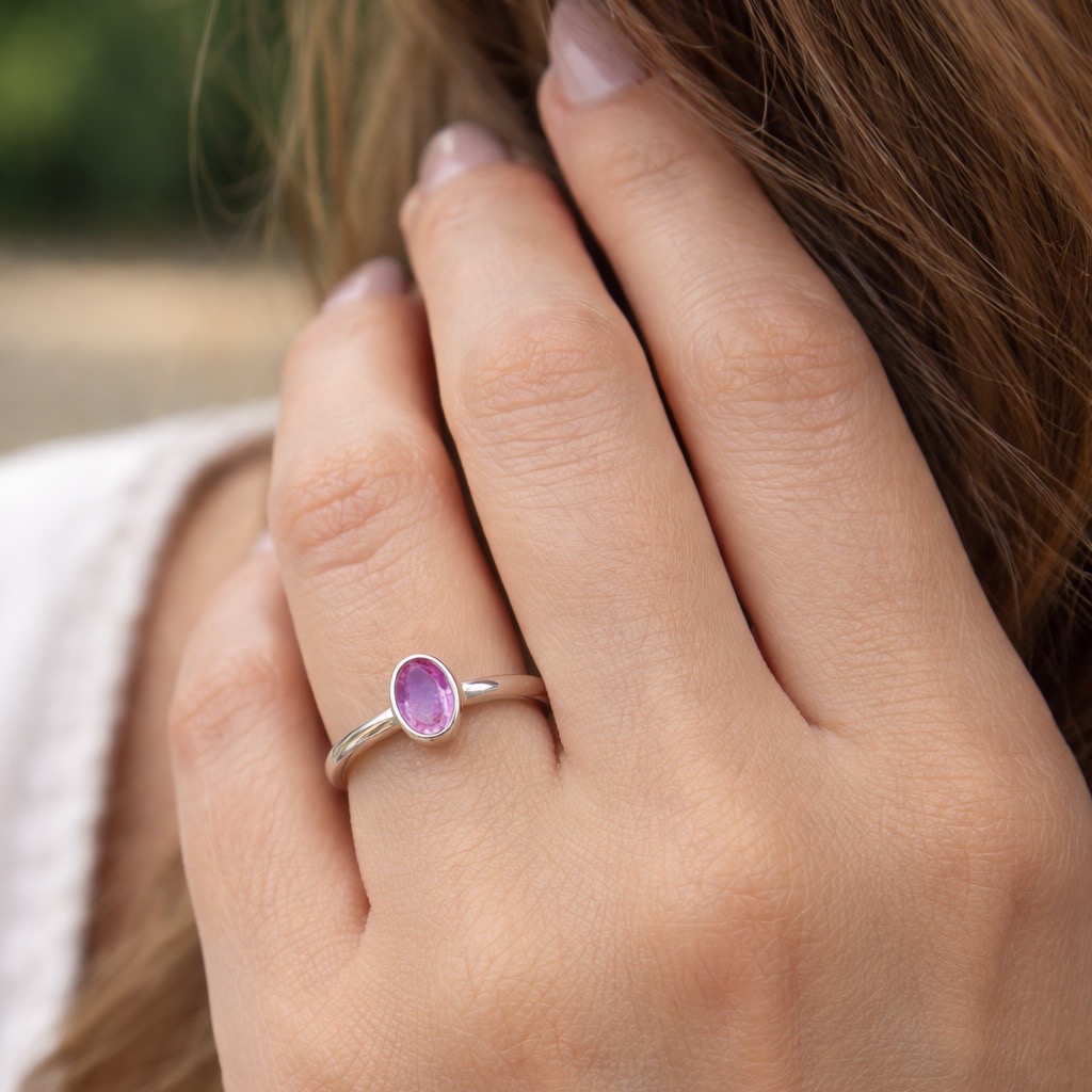 Showcasing a stunning contrast of colour and metal, this 9 Carat White Gold Pink Sapphire Ring is a beautiful modern classic. Hand-finished in our Devon studio, the design centres on a gorgeous 0.58ct oval Pink Sapphire measuring 6x4mm. The vibrant gemstone is held securely in a sleek collet setting, wrapping the stone entirely in bright white gold. This smooth profile not only protects the gem but ensures it will not catch on clothing, making it an ideal and comfortable choice for everyday wear.