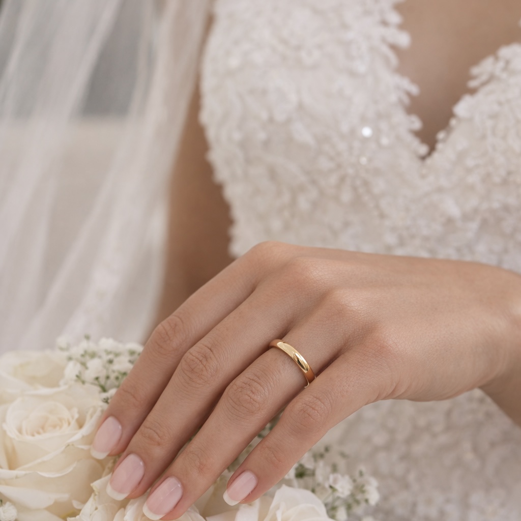 This elegantly proportioned handmade 9 carat gold wedding band features a traditional court profile and a flawless mirror-polished finish, providing both a timeless aesthetic and supreme everyday comfort.